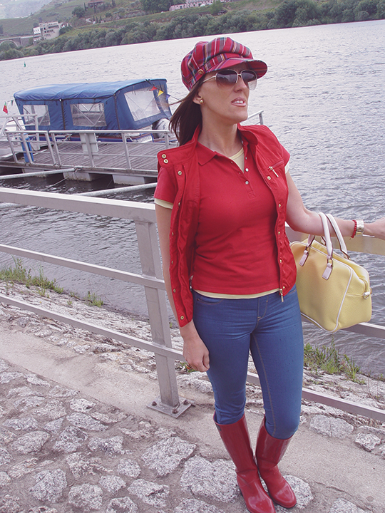 Um look descontraído e colorido é a nossa escolha de hoje. Vamos jogar com três cores existentes no xadrez escocês da boina. Optamos por usar uma t-shirt amarela, um pólo e um colete vermelhos. Pensamos em pôr a t-shirt por baixo do pólo de forma a que o amarelo iluminasse as peças vermelhas, e esta combinação resultou. Como as galochas também são vermelhas escolhemos as calças num tom de azul ganga, fazendo um contraste perfeito e a ponte de ligação entre o vermelho existente na parte de cima do conjunto e as galochas. Os acessórios em dourado e vermelho dão um toque de requinte. E para iluminar a toilette optámos por uma carteira em amarelo.